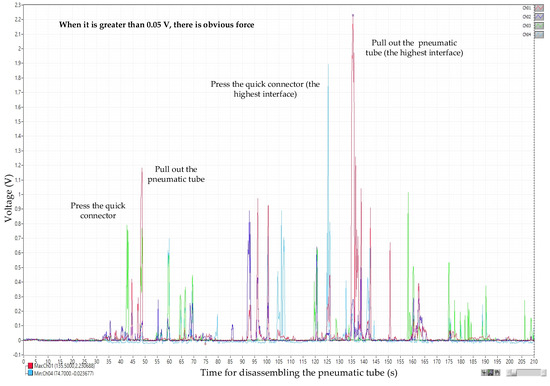 Figure 10 shows the disassembly operation of the pneumatic tubing, where the left thumb and index finger (Ch03, Ch04) are used to press the “collet ring,” followed by the right thumb and index finger (Ch01, Ch02) performing the pulling action. In contrast, during the assembly of the pneumatic tubing, simply inserting the tube into the quick connector completes the connection. The detailed force application during these processes was analyzed. Analysis of the experimental data indicates that the average force applied during disassembly of the lower port section of the pneumatic tubing is 6.454 N, and during assembly, it is 6.185 N. For the upper port section, the average disassembly force is 7.639 N, while the assembly force is 7.072 N. Therefore, when assembling or disassembling the pneumatic tubing at the lower port, the applied forces are approximately 1.185 N and 0.887 N less, respectively, compared to those at the upper port.