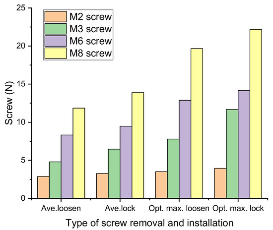 Analysis of the experimental data shows that the average loosing force is 2.876 N, the average fastening force is 3.266 N, the better maximal loosing force is 3.517 N, and the better maximal fastening force is 3.955 N for the M2 screw; the average loosing force is 4.791 N, the average fastening force is 6.472 N, the better maximal loosing force is 7.79 N, and the better maximal fastening force is 11.678 N for the M3 screw; the average loosing force is 8.322 N, the average fastening force is 9.477 N, the better maximal loosing force is 12.878 N, and the better maximal fastening force is 14.157 N for the M6 screw; and the average loosing force is 11.853 N, the average fastening force is 13.883 N, the better maximal loosing force is 19.659 N, and the better maximal fastening force is 22.177 N for the M8 screw. In the comparison of screws, Figure 11 shows that the fastening force is larger. [25].