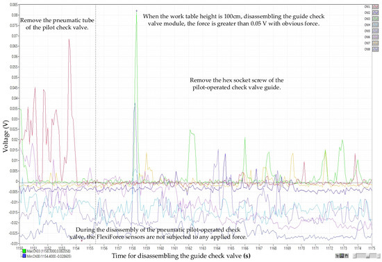 The selection range for effective voltage data is first set. The selection range for dividing table module, stamping cylinder module, and drilling cylinder module, except for the inductive anti-reverse valve, is between the minimal stamping cylinder 0.145 V and the maximal dividing table 2.135 V. Since the weight of inductive anti-reverse valve is relatively lighter than the rest three, the obvious force voltage 0.05 V, from the recording, is regarded as the minimal value, and the maximal value is the dividing table voltage 2.135 V, which is the same as the rest of the modules. The data analysis from disassembly picking/placing is shown in Figure 12, and the assembly picking/placing is shown in Figure 12, where the X-axis represents time (s) for recording voltage and the Y-axis represents the sensed voltage (V). By selecting the data in the disassembly/assembly timeline of the four major mechanism modules and exporting them into Excel files, the voltage of the fingers disassembling/assembling mechanism module (Ch01~Ch08) is averaged.