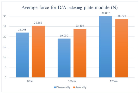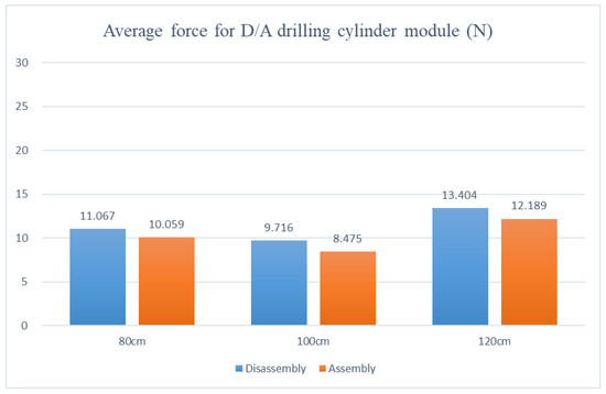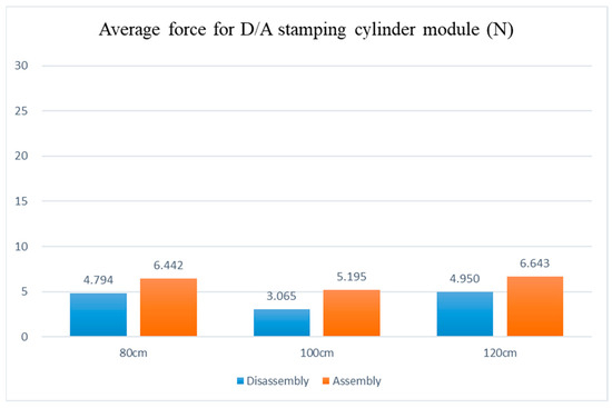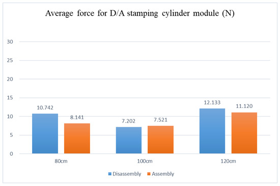 Analysis of the experimental data shows that the disassembly and assembly average force, with the adjustable table at 80 cm, appears as the dividing table at 22.008 N and 25.356 N, the drilling cylinder at 11.067 N and 10.059 N, the stamping cylinder at 10.742 N and 8.141 N, and the inductive anti-reverse valve at 4.794 N and 6.442 N, respectively. The disassembly and assembly average forces, with the adjustable table at 100 cm, reveal the dividing table at 19.03 N and 23.899 N, the drilling cylinder at 9.716 N and 8.475 N, the stamping cylinder at 7.202 N and 7.521 N, and the inductive anti-reverse valve at 3.065 N and 5.195 N, respectively. The disassembly and assembly average forces, with the adjustable table at 120 cm, show the dividing table at 30.057 N and 28.724 N, the drilling cylinder at 13.404 N and 12.189 N, the stamping cylinder at 12.133 N and 11.120 N, and the inductive anti-reverse valve at 4.950 N and 6.643 N, respectively. After comparing the three, as shown in Figure 13, Figure 14, Figure 15 and Figure 16, the least force is observed on the adjustable table at 100 cm, while the largest force is observed on the adjustable table at 120 cm. In other words, when the adjustable desk height is set to 100 cm, the total applied force is the lowest at 84.103 N. Conversely, at a height of 120 cm, the total applied force reaches the maximum at 119.637 N. This indicates that an optimal workbench height can help the operator save between 14.3933% and 35.2579% of physical effort.