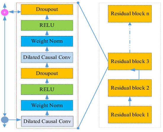 A residual block consists of dilated causal convolutions, weight normalization, ReLU activation functions, and dropouts. The TCN network is composed of many stacked residual blocks, as shown in Figure 1, which illustrates a TCN network with n stacked residual blocks. Each residual block has a convolution kernel size of k and a dilation factor of 2n − 1 in the n-th residual block.