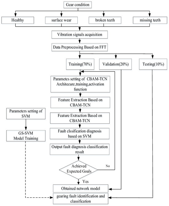 In this paper, we propose a novel fusion model, called CBAM-TCN-SVM, for intelligent gear fault diagnoses with small sample sizes. The model combines the advantages of different components to address the limitations of the existing approaches. First, fast Fourier transform (FFT) is used as a preprocessing step to transform the raw time-domain data of gear faults into the frequency domain, reducing noise and highlighting the key frequency components. The frequency-domain sequence data are subsequently fed into the CBAM-TCN model. The TCN module consists of multiple convolutional layers that can adaptively extract deep fault features from the input data. The CBAM module is incorporated into the TCN to enhance its feature extraction capabilities. CBAM enables the model to selectively focus on channels with key information, particularly in regions with significant signal morphology changes, highlighting the target detail information and reducing the redundant information. Finally, to further enhance the network’s classification capabilities, the SVM classifier is employed for intelligent classification.