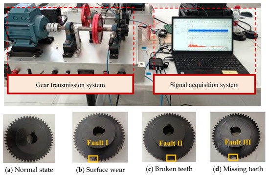 This study focuses on the diagnosis of three common mechanical faults of industrial gears: surface wear (Fault I), broken teeth (Fault II), and missing teeth (Fault III). To verify the validity of the hybrid model proposed in this paper, a gear transmission platform and the gear faults are established in the laboratory, as shown in Figure 4.
