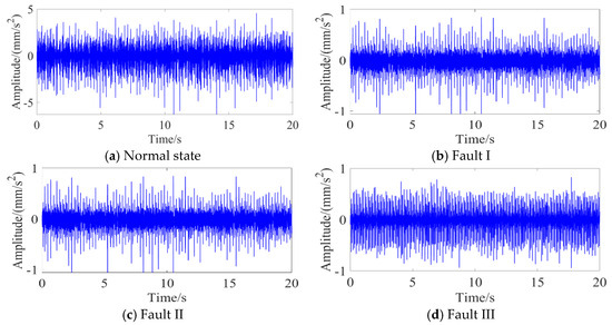 The experimental platform comprises two primary systems, a mechanical transmission system and a signal acquisition system. The mechanical transmission system integrates a Siemens three-phase AC motor, programmable controller, frequency converter, gear transmission mechanism, and couplings. To obtain high-fidelity vibration data, the signal acquisition system employs two low-noise accelerometers (AC500-2P) with a ±80 g peak measurement range and 100 mV/g sensitivity. These sensors are strategically mounted on both the horizontal and vertical axes of the gear transmission mechanism’s support bearings. Vibration data acquisition is performed via a GX400 four-channel data recorder at a sampling frequency of 48 kHz. Four operational conditions are investigated: normal operation and three fault modes (missing tooth, broken tooth, and surface wear). Vibration signals under these conditions are systematically collected, resulting in four distinct datasets. As illustrated in Figure 5, the vibrations in the time domain are presented for a comparative analysis across the four operational states.