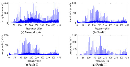 For the analysis, the frequency spectra of the four conditions are further given in Figure 6. In the normal state, the frequency spectrum is dominated by the fundamental frequencies related to the gear’s rotational speed and meshing frequency, with relatively low-amplitude harmonics. For Fault I, there are slight increases in the amplitudes of certain frequency components compared with those in the normal state, possibly due to the additional vibrations generated by surface wear. These increased amplitudes may be associated with the excitation of new resonant frequencies or the modulation of existing frequencies. Fault II results in more significant changes in the frequency spectrum. New frequency components appear, which are likely related to the impact forces caused by the broken tooth. These additional frequencies can be attributed to the transient vibrations generated when the broken tooth engages with other teeth during rotation. Fault III also shows distinct changes in the frequency spectrum. There are large-amplitude spikes at specific frequencies, which are a clear indication of the severe impact of the missing tooth on the gear’s vibration behavior. These spikes are likely associated with sudden changes in gear motion and the resulting dynamic forces. Overall, the frequency spectra provide valuable information about the different fault conditions, and the proposed fusion model can leverage these spectral features to accurately classify the gear faults, especially in scenarios with small sample sizes, as demonstrated in the experimental results.