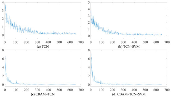 Among the traditional methods, radial basis function networks (RBFs), extreme learning machines (ELMs), random forests (RFs), and SVMs exhibit relatively low and stable accuracy levels, with values of −0.4. The introduction of deep learning methods represents a significant improvement. The CNN demonstrates a notable increase in accuracy, with the maximum accuracy reaching approximately 0.85. The hybrid models CNN-SVM and TCN-SVM also show promising results, suggesting that combining deep learning models with SVM can enhance the overall performance to some extent. The TCN stands out for its high accuracy, where the minimum, maximum, and average accuracies are relatively high, approaching 0.95; this highlights the TCN’s strong ability to handle the given data, which is likely due to its effectiveness in processing sequential or time series information. The proposed CBAM-TCN-SVM model achieves the best performance among all the methods. Both the minimum and maximum accuracy bars are the highest, and the average accuracy line approaches 1. This outstanding performance can be attributed to the integration of the convolutional block attention module (CBAM). The attention mechanism in CBAM enables the model to focus more on important features, thereby significantly improving the accuracy. In conclusion, the proposed CBAM-TCN-SVM model is superior to the other methods in terms of accuracy. Figure 8 further reveals the training dynamics, showing gradual stabilization and corresponding accuracy improvements for all the TCN variants during the iterative optimization. This observation underscores the inherent stability of TCN-based frameworks for fault detection, thereby validating the scientific importance of enhancing this foundational architecture.