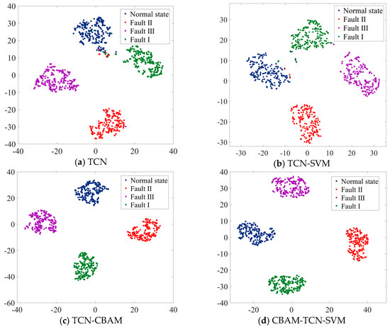 In Figure 9a, the data points of different states are somewhat clustered but with significant overlaps among them; this indicates that the TCN model alone has a certain ability to distinguish between different states, but the separation is not distinct enough, which may lead to relatively high misclassification rates. Figure 9b shows a slightly better separation than Figure 9a. The SVM component seems to enhance the model’s ability to define boundaries between the different state clusters. However, there are still some overlapping regions, especially between certain fault states, suggesting that while the combination improves performance, it is not yet optimal. Figure 9c shows a more refined clustering of data points. The addition of the CBAM helps the model focus on more relevant features, resulting in tighter and more distinct clusters for each state. The overlaps among the different state clusters are reduced compared with those of the previous two models, indicating an improvement in the model’s discriminative ability. Figure 9d shows the best performance among the four methods. The data points for each state form well-separated and compact clusters. The combination of CBAM, TCN, and SVM effectively leverages the strengths of each component. The attention mechanism in CBAM helps the model extract more informative features, the TCN processes the sequential information well, and the SVM establishes clear decision boundaries. This model has the greatest potential for accurately classifying different states with minimal misclassifications.