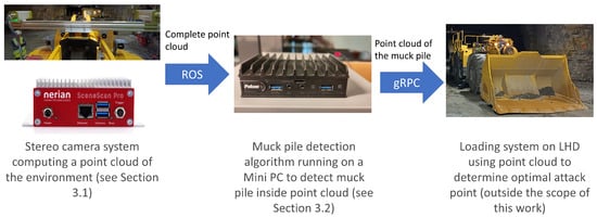 Our proposed method is based on a stereo camera mounted on an LHD. It continuously creates images and computes a point cloud from them. In the next step, this point cloud is further processed using a topological algorithm to decide whether it contains a muck pile and extract it. This information is sent to an internal software system controlling the LHD. This system will use the information to determine a good attack point and navigate to this point. The main components of the setup are illustrated in Figure 1.