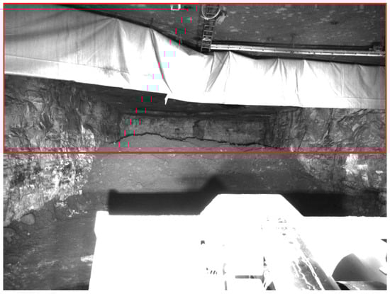 Even with additional headlights, an underground mining environment will always be relatively dark and, therefore, challenging for cameras. To mitigate this problem, attention was paid to the optical parameters controlling the brightness of the images. In particular, exposure time and gain were considered for this aspect. Exposure time denotes the time during which the optical sensors collect light before they combine it into an image. Gain is an electronic amplification of the optical signal and will linearly increase the brightness of the final image. To adapt to changing light conditions during operation, both exposure time and gain were automatically controlled. Every third frame, these parameters were set so that the upper half of the image achieved, on average, half intensity. The parameters were set only according to the top half to avoid including the bucket that is illuminated by the headlights and thus much brighter than the environment. Including it in determining the average would lead to overall much darker images, in which the environment would be harder to recognize. Figure 3 shows an exemplary image in which the area used to determine image brightness is marked with a red rectangle.
