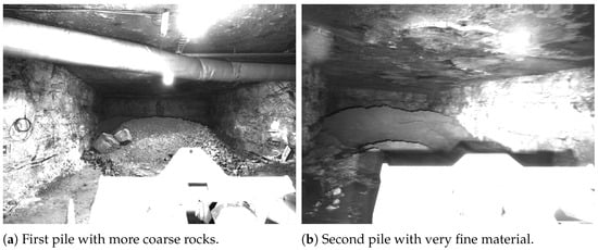 As the next step, integration tests were performed in Kvarntorp to make sure the system works in combination with the attack point analyzer to provide the necessary data for automatic loading. During the final integration test, 44 automatic loading attempts were performed on two different muck piles. The first pile was 11.4 m wide. Its stope could be entered in a straight line or around a curve, both of which were tested. The second pile was 10.7 m wide. Its stope could only enter around a curve. This pile was more challenging, as, due to repeated loading and unloading, the material became very fine. Since it also had high water content, in combination, it looked mostly like mud. This yielded less optical contrast inside the pile than would be expected from fragmented rock, which made the stereo matching more challenging. Figure 6 shows a side-by-side comparison of the two piles.