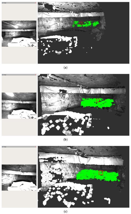 Muck pile detection results from a single loading sequence at a distance of 30 m (a), 25 m (b) and 20 m (c) from the camera respectively. On the left, the image from the left camera is shown, while the right shows the computed point cloud using the color information from the left camera with the detected muck pile points marked in green. The red square has a size of m to illustrate the scale. The pile is 12.1 m wide and 3.8 m high. It was estimated as 12.5 m wide and 2.92 m high (a), 12.1 m wide and 3.46 m high (b) and 12.7 m wide and 3.42 m high (c) respectively. Even though this sequence represents a challenging case where the stereo matching suffers under low optical contrast in the pile, relatively good segmentation can still be achieved at a distance of 25 m from the camera.