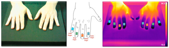 Regions of interest (ROIs) were identified on the distal phalanges of the index, middle, ring, and little fingers of both hands, shown in Figure 1. This anatomical selection is based on prior literature and preliminary measurements, which confirmed the reproducibility and consistency of thermal responses in these areas. The fingers, being highly vascularized and responsive to sympathetic stimuli, provide an optimal site for evaluating cutaneous thermoregulatory dynamics. The figure illustrates the precise positioning of the ROIs used for quantitative analysis of the thermal recovery ratio (TRR) and the integral (INT) parameters.
