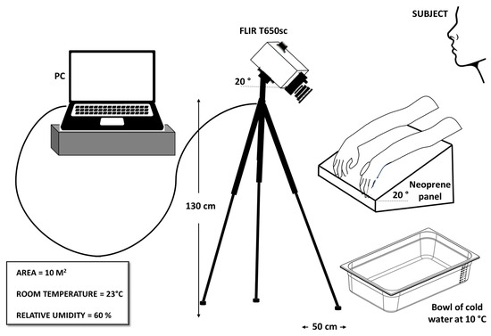 The camera, inclined of 20°, was mounted on a tripod stand, adjusted to approximately 130 cm above the floor and 50 cm away from the sample. The neoprene panel was employed as a support for the hands, and its opacity was exploited to prevent unwanted reflections. The first problem in a thermographic measurement is to find a uniform surface that can reduce undesirable reflections on which to place the investigating sample. For this purpose, after various tests with different materials, such as paper or wood, the neoprene panel was taken into consideration. It was tilted 20° to promote blood circulation for temperature recovery after CST.