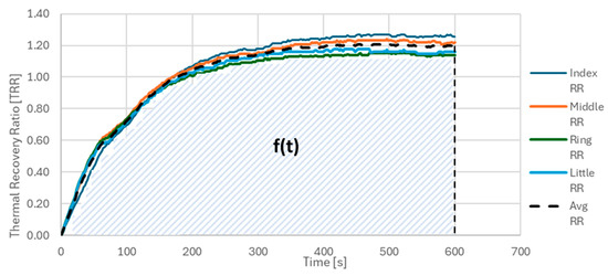 To minimize the error due to the thermal camera measurement in the temperature calculation, only the temperature differences were considered. Furthermore, after calculating the trend of the distribution of the temperature differences for the four individual ROIs, i.e., the TRR for the index, middle, ring, and little fingers, the average of the four TRRs was calculated. Figure 3 shows the trend of the TRR as a function of the acquisition time for the individual ROIs considered. For brevity, the case relating to the right hand of a CS has been reported. The curves relating to the TRRs of the individual ROIs are shown in different colors, while the average of the four TRRs is represented in black with a dashed line.