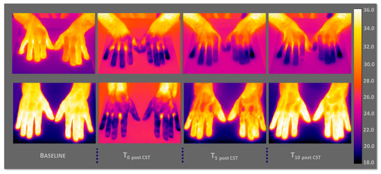 Figure 5 shows, respectively, the thermographic images of a PD (on the top) and a CS (on the below) with a graduated scale of temperature between 18 and 36 °C. More in detail, the basal thermal distribution of the hands before the CST (baseline, reported in the left), immediately afterwards the test (T0 post CST), after 5 min (T5 post CST), and 10 min of CST (T10 post CST).