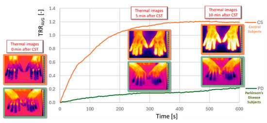 Figure 6 reports the TRR average as function of the acquisition time calculated in the case of the right hand of a CS (orange line) and a PD (green line) with the corresponding thermal images at 0, 5 min, and 10 min after CST.