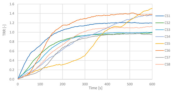 TRR values over time for all control subjects. Each line represents one CS. A consistent rewarming trend is visible across the group, with most TRR values increasing toward 1.0 during the 10 min post-CST period.