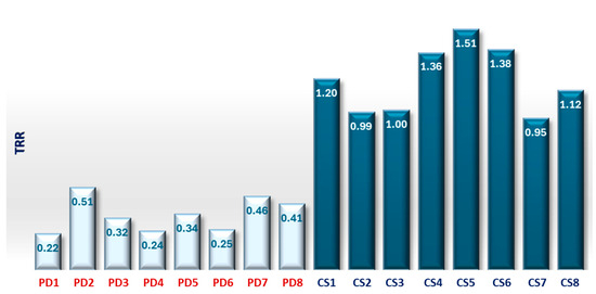 TRR is a parameter that in these measurements showed values less than 0.5 for an illness subject and greater than or next to 1.0 for a healthy subject. PD patients maintain a fairly constant temperature values and show a low TRR. The mean value of the TRR has been calculated for all subjects; PD and CS are reported in the histogram below, see Figure 9.