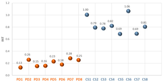 Similar results also showed the second prognostic parameter, INT, shown in the scatter diagram of Figure 10. PD subjects exhibit lower INT values compared to CS.