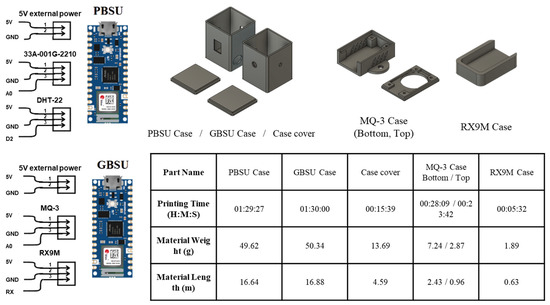 Gas-related fermentation data were obtained using the GBSU, as shown in Figure 1. The GBSU was built with the same microcontroller unit used in the PBSU (Arduino Nano 33 IoT; Arduino, MA, USA). Two gas sensors were integrated with the microcontroller: an alcohol sensor (MQ-3, SEN040411; Henan Hanwei Electronics Co., Ltd., Zhengzhou, China) and a carbon dioxide sensor (RX-9M; Samyoung S&C, Incheon, Republic of Korea). All components were fabricated from the same materials and under the same printing conditions as the PBSU enclosure.