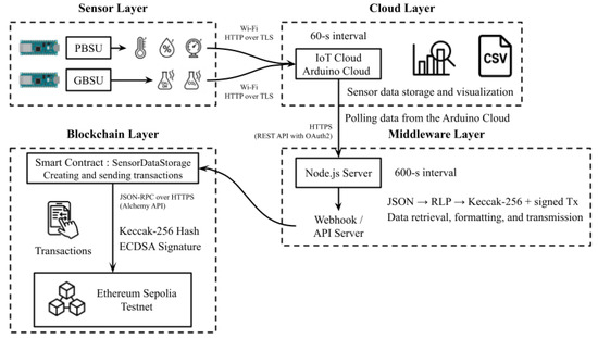 A multi-layered FBCS was designed to ensure traceability and resistance to data tampering in fermentation monitoring. In the sensor layer, the PBSU and GBSU collected environmental parameters—including temperature, humidity, pressure, and gas concentrations—at 60 s intervals and transmitted them to the Cloud Layer via Wi-Fi using HTTP over TLS. The cloud layer employed Arduino Cloud services to store and visualize the data streams. In the middleware layer, a Node.js server periodically retrieved the cloud data, reformatted it into blockchain-compatible structures (JSON, RLP, Keccak-256), and generated ECDSA-signed transactions. These signed records were then transmitted to the blockchain layer, where they were immutably stored through interaction with a smart contract (SensorDataStorage) deployed on the Ethereum Sepolia Testnet via the Alchemy API.