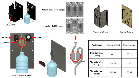 The Fermentation Quantification Sensing Unit (FQSU) was developed following the methodology of Jeong and Kim (2025) [44]. For model training, image data were acquired using a custom-designed fermentation chamber. Fermentation activity was indirectly assessed by monitoring CO2 release through an airlock system with a transparent U-trap filled with either distilled water or ethanol, enabling visual tracking of bubble formation. An HD C922 Pro Webcam (VU0060; Logitech Inc., Newark, CA, USA) was mounted inside the chamber on a 3D-printed holder, ensuring a stable and consistent viewing angle of the U-trap. To minimize ambient light interference, the chamber was enclosed, and image acquisition was performed continuously throughout fermentation. The FQSU configuration is illustrated in Figure 3.