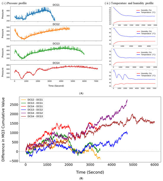 Figure 7A illustrates the temporal progression of internal pressure in DCG as recorded by the PBSU during fermentation. The gradual increase in pressure reflects continuous microbial CO2 production, a metabolic byproduct of substrate degradation [48]. In DCG1, pressure rose slowly from an initial analog value of 279 to a peak near 470, followed by a sharp decline toward the end of monitoring, suggesting a relatively short fermentation phase likely due to early depletion of fermentable substrates. By contrast, DCG2 and DCG3 exhibited steadier, more sustained increases, reaching peak pressures of 521 and 516, respectively, and maintaining elevated levels for longer durations. These profiles indicate more stable and prolonged fermentation activity compared with DCG1. DCG4 showed the most pronounced pressure dynamics, beginning at 415 and steadily climbing to a maximum of 792. The recurring fluctuations observed in its pressure curve suggest multiple stages of microbial activity, potentially influenced by variable substrate availability or shifts in microbial community structure. Among all conditions, DCG4 appears to have undergone the most vigorous and sustained fermentation. Throughout all experiments, temperature and humidity remained stable.