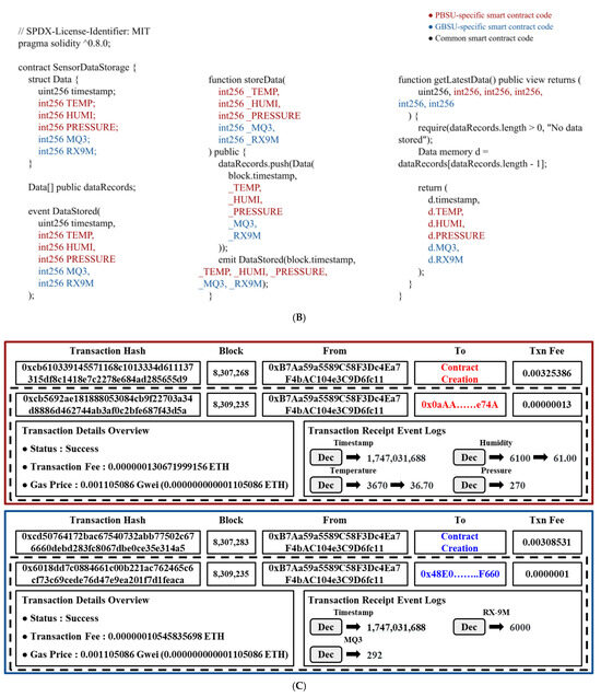 While deployment overhead remained minimal, real-time operation involves continuous data submissions. In particular, the use of two smart contracts for PBSU and GBSU implies that multiple transactions may be triggered every 60 s when transmitting temperature, humidity, pressure, and gas sensor values. Prior evaluations of the Ethereum Sepolia testnet indicate median confirmation times of approximately 57 s, with smart contract interactions averaging 10–25 s under typical loads [50]. Concurrent transactions, however, can saturate 80–90% of block capacity, leading to increased delays of 15–30 s or more in high-throughput conditions [51].