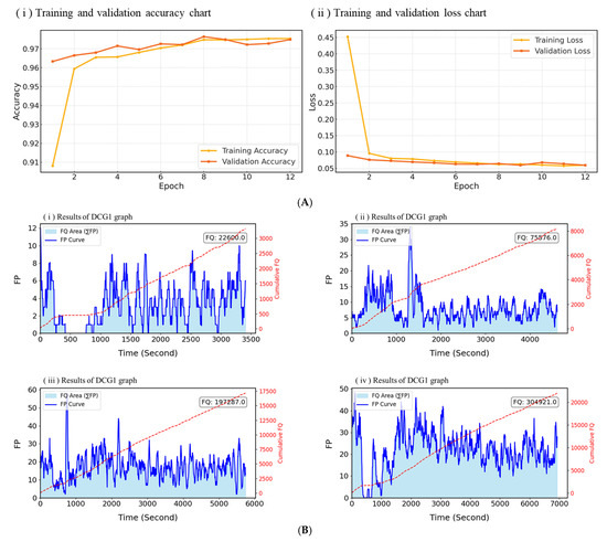 (A) Training and validation accuracy and loss of CFQM. (B) FP and cumulative FQ in DCG.