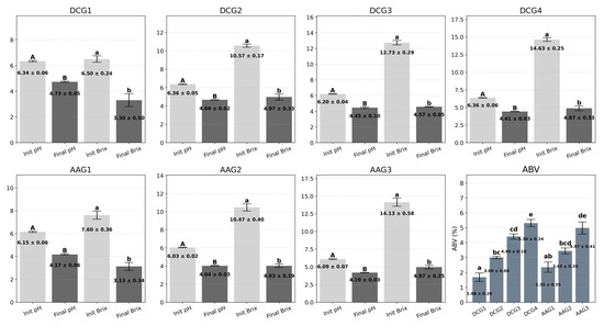 Analysis of pH, Brix, and ABV in DCG and AAG. Values are presented as mean ± standard deviation. Different uppercase or lowercase letters indicate significant differences at p < 0.05.