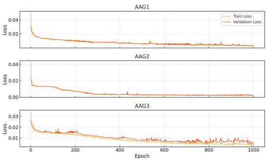 To assess the predictive performance of the FPPM, three separate LSTM models were trained using time-series sensor datasets obtained from the AAG1, AAG2, and AAG3 fermentation experiments. The number of training samples for each dataset was 25,324 for AAG1, 26,495 for AAG2, and 27,635 for AAG3. All models were trained for 1000 epochs under uniform training conditions. The AAG1 model achieved a final training loss of 0.00270 and a validation loss of 0.00314. For AAG2, the training and validation losses were 0.00181 and 0.00210, respectively. The AAG3 model exhibited a training loss of 0.00361 and a validation loss of 0.00596 (Figure 11).
