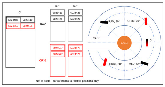 Diagrammatic and photographic explanation of the experimental set up at the UKHSA. Note that in this experiment, we compared standard CR39 detectors at 0°, 30°, and 60° angles to the source with alternative detectors (RAV) with a different plastic formulation. We do not report on the latter in this paper.