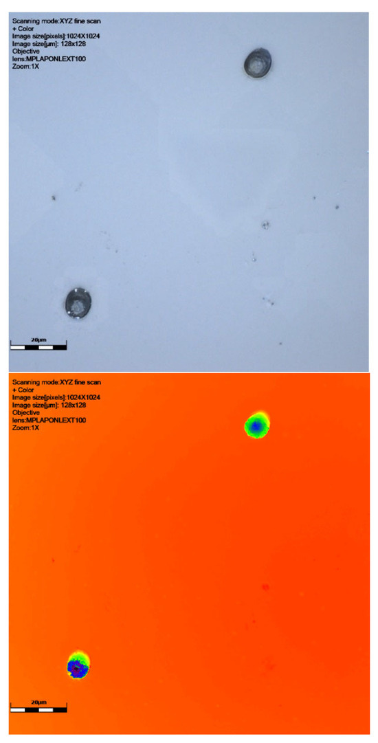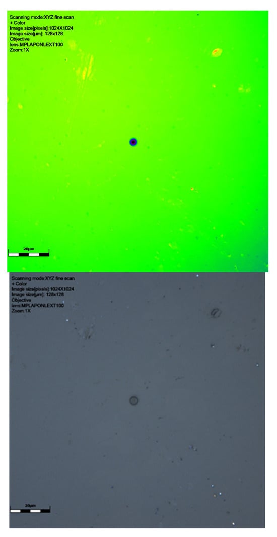 The application of 3D laser scanning confocal technology for imaging of nuclear tracks is a technique developed by Wertheim and Gillmore [17] and adapted to illustrate and provide detailed measurements of other materials such as volcanic ash particles [25] and other particulates (e.g., PM10s and PM2.5s) [26]. This technique allows us to scan a sample with a laser point by point, detecting the reflected light through a pinhole in front of the microscope’s light detector, to eliminate out of focus light. This ensures that the image is sharp and clear with minimal blur. The sample can be scanned in slices, adjusting the focal point and measuring the intensity of reflected light. From the collected data, a 3D image can be created. This technique allows us to quantify tracks and particles, providing, in the case of nuclear tracks, the depths, widths, morphologies, volumes of tracks, and precise track angles. These 3D images can then be animated and viewed from whatever orientation is desired. Typically, alpha and neutron tracks in SSNTDs are viewed by 2D optical microscopy, although other methods have also been utilised such as scanning electron microscope (SEM)/atomic force microscope (AFM) analyses [24]. Laser confocal imaging allows for direct, noninvasive serial optical sectioning with a minimum of sample preparation. This differs from AFM, which requires a probe to interact with the surface of the sample, and SEM analysis, where the sample must be mounted appropriately to be viewed. SEM analysis typically requires coating the sample in conductive material to prevent charging effects and improve image quality. The image produced is an electronic representation rather than a direct colour image, which is produced by scanning laser confocal imaging.