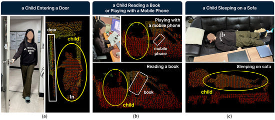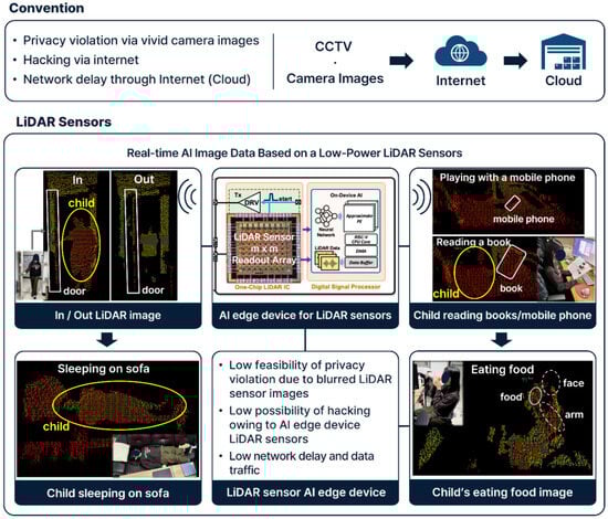 LiDAR technology, particularly in Human-Activity-Recognition (HAR), has shown promise for higher-fidelity behavioral detection. Rinchi et al. (2023) reviewed LiDAR’s application in posture detection, movement trajectories, and room-level spatial mapping, emphasizing its non-contact advantages [23]. Alvarez et al. (2018) developed PeTra, a depth-sensing system using LiDAR and Kalman filtering to track limb motion, supporting privacy-conscious, real-time monitoring [24]. Furthermore, portable three-dimensional LiDAR systems have been developed for long-term and wide-area people behavior measurement, highlighting their utility in extensive spatial monitoring while maintaining privacy [25]. LiDAR point clouds are also being utilized to assess temporal behavior in complex environments like urban settings, showcasing their capability for dynamic behavioral analysis [26]. However, these applications are mostly found in robotics, automotive, or industrial contexts—not in compact, child-centered residential settings. Few studies explore how LiDAR can be used ethically and effectively for children in less supervised domestic environments. Figure 1 describes the advantages offered by a LiDAR sensor in domestic environments as an AI edge device, such as low privacy violation, low hacking possibility, and low network delay. It also shows some examples of image data taken from a LiDAR sensor, including a child coming in and out of a door, a child reading a book or a mobile phone, a child sleeping on a sofa, and a child eating food.