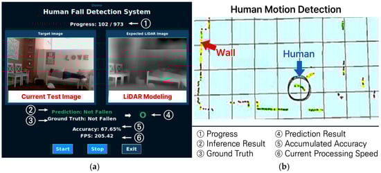 Figure 2a shows an application of a LiDAR sensor for human fall detection, where a LiDAR sensor image is compared with that of a camera. The average accuracy of a LiDAR sensor for fall detection could reach 68%, as described in Ref. [27]. Also, Figure 2b depicts a two-dimensional map of a human motion, where a real-time motion detection could be facilely acquired with a LiDAR sensor.