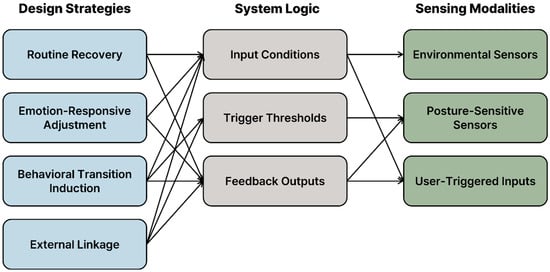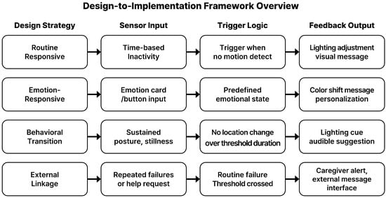 This section presents a structured design framework that translates high-level behavioral intentions into implementable sensor-driven system logic. Developed to support children’s autonomy and emotional well-being, the framework consists of four core strategies that leverage ambient cues to gently guide behavior. Each strategy is transformed into a logic structure comprising input conditions, trigger thresholds, and feedback outputs. Then, this section concludes with a discussion of sensing modalities required for accurate and ethical system implementation.