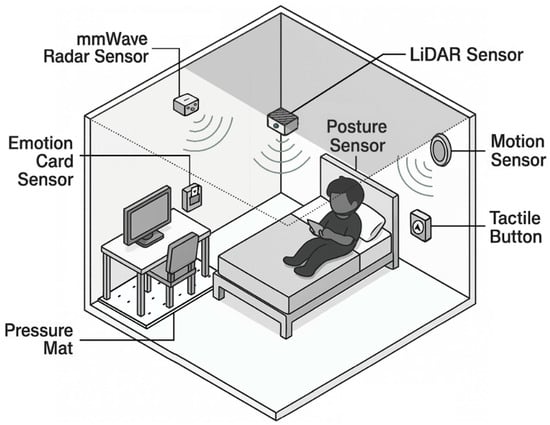 Three sensor configurations are considered across the system. Although environmental sensors offer minimal intrusiveness and cost-effectiveness, they lack the ability to detect posture or prolonged inactivity. However, their utility in occupancy detection and basic activity recognition in smart buildings, sometimes augmented with fusion techniques, is well established [20,21]. Low-resolution LiDAR provides higher behavioral fidelity and adjustable privacy features. Yet, it mandates precise placement and moderate preprocessing. Its capabilities in human activity recognition, including posture and movement tracking for privacy-preserving monitoring, are widely reviewed [23,24,25,26]. Either mmWave radar or thermal IR excels in privacy and subtle motion detection, but presents algorithmic complexity and limited precedent in home settings. Recent studies highlight mmWave radar’s potential for environment-invariant micro-motion sensing and activity classification in real environments, even for children [32,33]. Each configuration involves tradeoffs along a spectrum of usability and ethical fit.