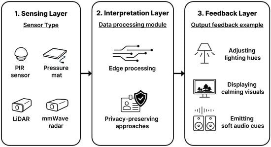 Advanced ambient sensing technologies have been transforming spatial design, enabling the creation of dynamic environments that not only serve as passive shelters but also act as active platforms to guide children’s behavior, accommodate emotional states, and foster autonomy. In recent years, interdisciplinary efforts from architecture, human–computer interactions (HCI), and user experience (UX) design have proposed sensory-friendly environments, particularly for neurodiverse populations [1,2]. These environments aim to regulate stress and create calming spatial cues through elements like lighting, acoustics, and material textures. However, many of these existing approaches, while valuable, often remained conceptual or demonstrative, primarily focusing on static sensory mitigation rather than dynamic behavioral adaptation. For instance, Mostafa’s (2008) pioneering work laid out spatial principles for autism-friendly architecture, emphasizing predictability, acoustic zoning, and visual cues [1]. Crucially, these strategies were predominantly static, lacking real-time response mechanisms to user behavior. More technologically adaptive approaches include Deng and Rattadilok (2022), who developed a sensor and a machine learning-based sensory management system for children with Autism-Spectrum-Disorder (ASD) that responds to physiological signals [3]. Similarly, Voss et al. (2019) introduced Superpower Glass, a wearable device providing social-emotional feedback to children with ASD via facial emotion recognition [4]. While these studies demonstrated the feasibility of emotionally responsive systems, their reliance on wearable devices or high-contact interventions limited their suitability for truly non-intrusive, space-embedded applications in domestic environments. Furthermore, the broader field of Human Activity Recognition (HAR) in smart living services has highlighted the critical need for solutions that balance context awareness, data availability, personalization, and privacy [5].