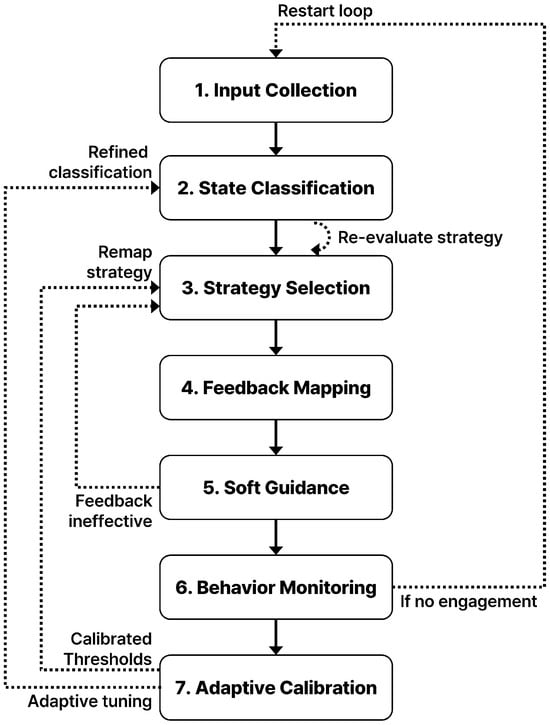 External Linkage is activated when the system detects patterns of repeated disruption or distress. Utilizing simple pattern recognition algorithms, it identifies the thresholds that warrant external support, e.g., frequent help requests or sustained inactivity. Once triggered, alert messages are sent to caregivers or linked support systems to ensure timely intervention. This strategy is grounded in Bronfenbrenner’s ecological model of development (Bronfenbrenner, 1979 [11]), which highlights the critical role of broader ecological support systems (e.g., family, caregivers) in a child’s development and well-being, especially for vulnerable children experiencing care deficits. Altogether, these strategies prioritize autonomy over compliance. Rather than directing behavior, the system creates an environment that subtly responds to and supports the child’s actions, while preserving their dignity and agency.