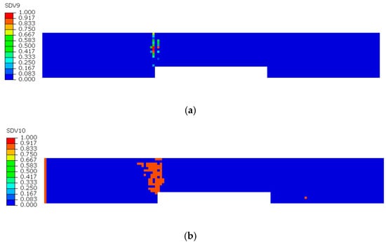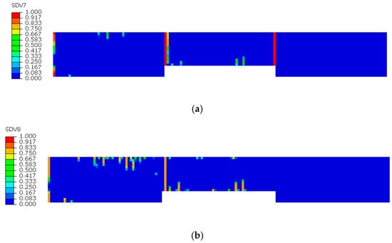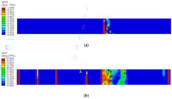 Figure 8, Figure 9 and Figure 10 illustrate the damage evolution of model S2 during the tensile process, where SDV7–SDV9 represent fiber tensile damage, fiber compressive damage, matrix tensile damage, and matrix compressive damage, respectively. The values in the legend indicate the damage state of the CFRP laminate, with 0 representing no damage and 1 indicating complete failure.