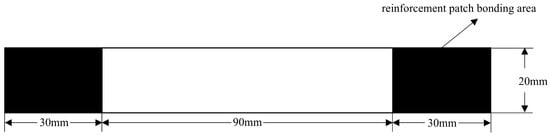 Three sets of specimens were prepared as shown in Figure 13, Figure 14, Figure 15, Figure 16, Figure 17 and Figure 18. The first and second sets consisted of undamaged specimens, while the third set contained specimens with a 50 × 5 mm artificial defect introduced by post-cure machining. To prevent damage to the gripping ends during subsequent tensile testing on a hydraulic machine, reinforcing tabs were bonded to the specimen clamping regions using LOCTITE E-20HP epoxy adhesive.