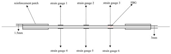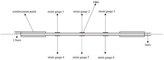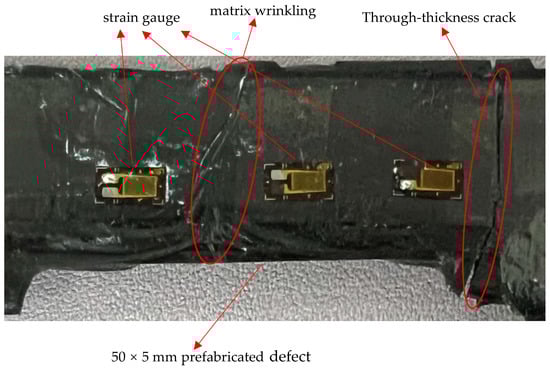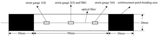 The first set comprised three specimens without any surface-mounted strain gauges or embedded FBG sensors. The second set included three specimens instrumented with BE120-3AA-P2K(GUOXINGHUAYU, Beijing, China) resistance strain gauges on the surface and an FBG sensor embedded between the 10th (0° ply) and 11th (0° ply) layers at the center. The third set contained two defective specimens, similarly equipped with surface-mounted BE120-3AA-P2K strain gauges and an embedded FBG sensor between the 10th and 11th layers. The specimen configuration and sensor arrangement are illustrated in the accompanying figures, with detailed specifications provided in Table 2.