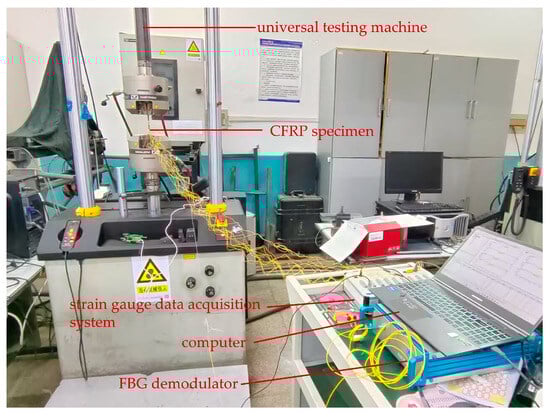 In this study, tensile failure experiments were conducted on CFRP laminates with dimensions of 150 mm × 20 mm × 3 mm. During the tensile tests, strain data from both surface-mounted electrical resistance strain gauges and embedded FBG sensors were collected. The strain gauge data were acquired using a GH3840 dynamic and static signal testing system(GUOXINGHUAYU, Beijing, China), while the FBG strain data were recorded by a custom-built fiber Bragg grating demodulation device. All acquired data were processed and archived using corresponding computer software.