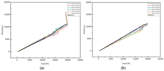 Strain versus load curves: (a) Specimen 2-1; (b) Specimen 2-2.
