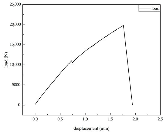 The strain–load relationship diagram measured by the FBG shows that when the load is less than 11,030 N, the strain–load relationship is linear, indicating that the central region of the laminate is in the elastic deformation stage without internal damage. When the load reaches 11,030 N, a phenomenon occurs where the load remains constant or decreases while the strain changes dramatically, suggesting that microscopic damage begins to develop at the interlaminar region where the FBG is located. The subsequent curve exhibits clear nonlinearity, with small abrupt jumps and sudden increases, indicating that the interlaminar damage detected by the FBG sensor is continuously expanding. Finally, the central wavelength of the FBG can no longer be captured after the load exceeds 19,717 N, which is likely due to fiber breakage in the internal layers of the laminate and damage to the FBG grating region, rendering it unable to continue collecting signals.