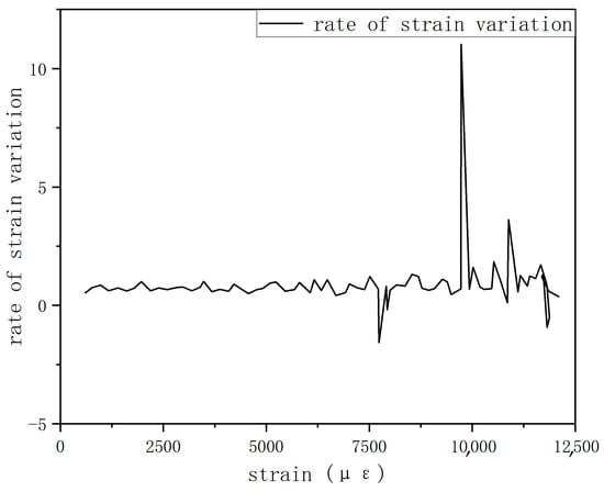 In Figure 24, the black line represents the strain–load curve monitored by the FBG sensor at the right-side damage location embedded in the center layer of the composite laminate. To highlight minor strain variations, the strain rate curve of this strain–load curve was calculated to amplify the subtle changes. As shown in Figure 24, a noticeable change in the strain rate is observed near a load of approximately 8000 N: before this point, the strain rate remains consistently positive, averaging about 0.8 με/N, but at 8000 N, it turns negative for the first time, reaching about −1.57 με/N. This suggests that initial damage, such as resin cracking, fiber/matrix interface debonding, or microcracks, may begin to occur in the local area. Although such damage causes only minor changes in the macroscopic strain curve, it significantly affects local stiffness, manifested as a sudden increase in the absolute value of the strain rate. The appearance of negative values indicates local relaxation or microstructural abrupt changes, meaning that despite the increasing load, the overall strain decreases instead.