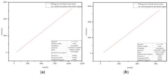 The fitting results are presented in Figure 25, where Figure 25a shows the linear fitting result for the strain–load curve of the intact laminate during the elastic stage, while Figure 25b displays the corresponding result for the defective laminate under the same conditions.