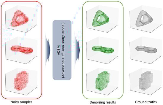 Inspired by the success of adversarial learning in generative models [22,23,24,25], we propose the Adversarial Diffusion Bridge Model (ADBM), which integrates adversarial supervision into the diffusion bridge framework to enhance 3D point cloud denoising. Specifically, a lightweight discriminator is incorporated into the training pipeline to compel the diffusion bridge model to generate outputs that are not only distributionally close to clean data but also perceptually realistic. As shown in Figure 1, ADBM effectively restores clean shapes from severely noisy inputs across various object categories. The adversarial signal complements the original diffusion bridge objective, providing an additional learning signal that facilitates the recovery of fine geometric details, particularly under complex or non-Gaussian noise conditions. We validate ADBM on PC-Net [15] and PU-Net [26], 3D object-level point cloud datasets. The experimental results demonstrate that ADBM consistently outperforms existing state-of-the-art denoising methods in terms of both fidelity and generalization. In summary, the main contributions of this paper are as follows: