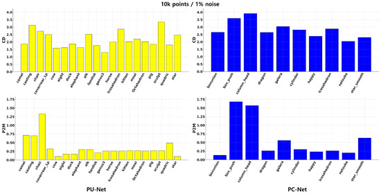 To further investigate the generalization behavior of the proposed method, we conducted a class-wise performance analysis on both the PU-Net and PC-Net datasets. Figure 3 presents the CD and P2M metrics for each class under the 10 k point and 1% Gaussian noise setting. The results reveal that reconstruction difficulty varies substantially across object categories, with geometrically complex structures (e.g., chair, elk) exhibiting higher error values. In contrast, objects with smoother or more compact surfaces tend to yield lower reconstruction errors, reflecting the relative ease of recovering their geometric details. Notably, the model maintains competitive performance across unseen PC-Net shapes, indicating robust generalization to novel object geometries. These observations indicate that the model effectively captures transferable structural priors rather than overfitting to the training distribution.