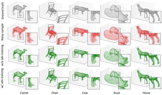 To qualitatively evaluate the denoising performance, Figure 4 presents visual comparisons across various object categories. The first row shows the ground-truth clean point clouds, uniformly sampled with 10 k points per object. To generate the noisy inputs shown in the second row, Gaussian noise with a standard deviation of 1% unit sphere radius is added to the clean shapes. These noisy point clouds exhibit substantial structural distortion and irregular point distribution, particularly around thin or intricate regions such as the camel’s legs, the chair’s backrest, and the curvature of the duck shape. The third row shows the outputs produced by the P2P-Bridge baseline without adversarial learning. While the overall shapes are recovered to some extent, the results often suffer from blurring or loss of fine details. For instance, the legs of animal models appear less distinct, and the duck’s bill lacks geometric sharpness and continuity. In comparison, the proposed method, in the fourth row, restores both global structure and fine-grained geometric details. The denoised results exhibit more faithful alignment with the ground truth, better preserving object-specific characteristics and surface continuity. Moreover, the point distribution appears more uniform and natural, indicating improved surface coverage and sampling quality. These qualitative observations are consistent with the quantitative results, highlighting the superior denoising capability and structural fidelity of our method across diverse shapes.